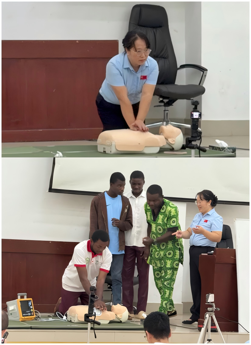 医疗队队长郭娟娟医生为大家带来了“心肺复苏:手的超能力”的专题讲座,向师生们讲解了判断意识和呼吸、正确拨打急救电话、胸外按压的基本方法以及除颤仪DEA的使用要点,并强调急救中“敢做、快做、正确做”的重要性。郭娟娟医生现场示范了心肺复苏的主要步骤,并邀请学生们上台体验。同学们在医生的指导下尝试了按压动作和人工呼吸,在实践中加深了对急救的理解。