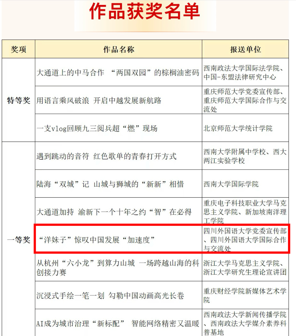 据悉,大赛共收到来自全国各地130多家高校、中小学校、企事业单位、基层单位和科研院所的投稿作品536件,评选出特等奖3件、一等奖7件、二等奖20件、三等奖30件。在《“洋妹子”惊叹中国发展“加速度”》中,我校来自吉尔吉斯斯坦的外教金淑贤用字正腔圆的普通话分享她对民生福祉的所见所闻,见证了中国经济社会发展的“加速度”。该视频作为“全国两会特别策划——外国青年眼中的政府工作报告”系列短视频之一,被中宣部阅评组评为全国两会优秀报道作品,在“学习强国”、西部国际传播中心等国内外平台推送,取得良好传播效果,全网播放量已超过150万。在《从赤道几内亚到魔幻之都 在citywalk中开启赛博漫游》中,我校留学生覃月以外籍青年的视角展现了重庆传统与现代碰撞的城市风光和别具特色的历史风貌,被“学习强国”等平台转载,全网播放量超过20万。
