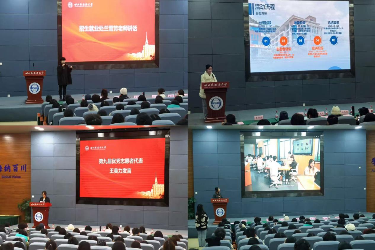 活动现场,全体与会人员共同观看了往期活动精彩回顾视频。从返校分享的鲜活场景到真诚互动的温暖瞬间,让大家深刻体会到母校行活动“校友反哺、经验赋能”的深厚内涵。接着,招生就业处兰雪芳老师强调了活动的育人价值与社会意义,鼓励大家以真诚的态度和专业的知识,圆满完成此次“反哺”之旅,充分展现川外学子的青春风采与责任担当。随后,第九届优秀志愿者代表王美力结合自身实践经历,从活动筹备、团队协作、责任传承和服务延伸四个维度分享心得。本科招生助理团负责人李蕊就本次活动的整体流程、安全须知、材料准备、成果提交规范及评优机制等进行了清晰细致的解读。本科招生助理团副主席赵慧敏从内容组织、表达技巧、互动设计到仪表仪态,全方位展示了如何开展一场生动、深入、有吸引力的宣讲。与会老师及助理逐一解答志愿者们的提问,结合实际案例给出具体建议。大会最后,全体志愿者合影留念,有序领取活动物资,以饱满的热情整装待发,迎接即将到来的寒假母校行活动。