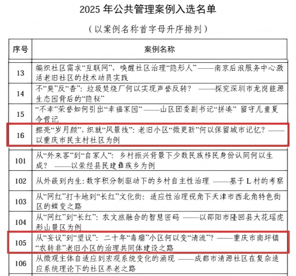 本次2篇入库案例,是学校公共管理师生团队深耕调研实践、潜心研究的智慧结晶,更是四川外国语大学-重庆图书馆共建的重庆市研究生联合培养基地共同努力的标志性成果。案例指导教师是重庆图书馆MPA指导教师王宁远、曾婧团队和国际关系学院余雅洁老师,学生团队由2023级硕士研究生王瑶、田维杰、赵骏豪同学组成。两篇案例题目分别是:《擦亮“岁月颜”,织就“风景线”:老旧小区“微更新”何以保留城市记忆?——以重庆市民主村社区为例》和《从“妄议”到“望议”:二十年“毒瘤”小区何以变“清流”?——重庆市南坪镇“农转非”老旧小区的治理共同体建设之路》。