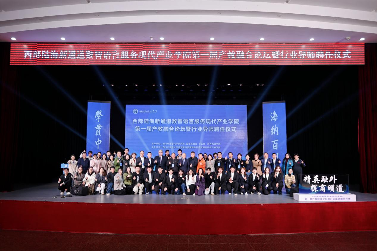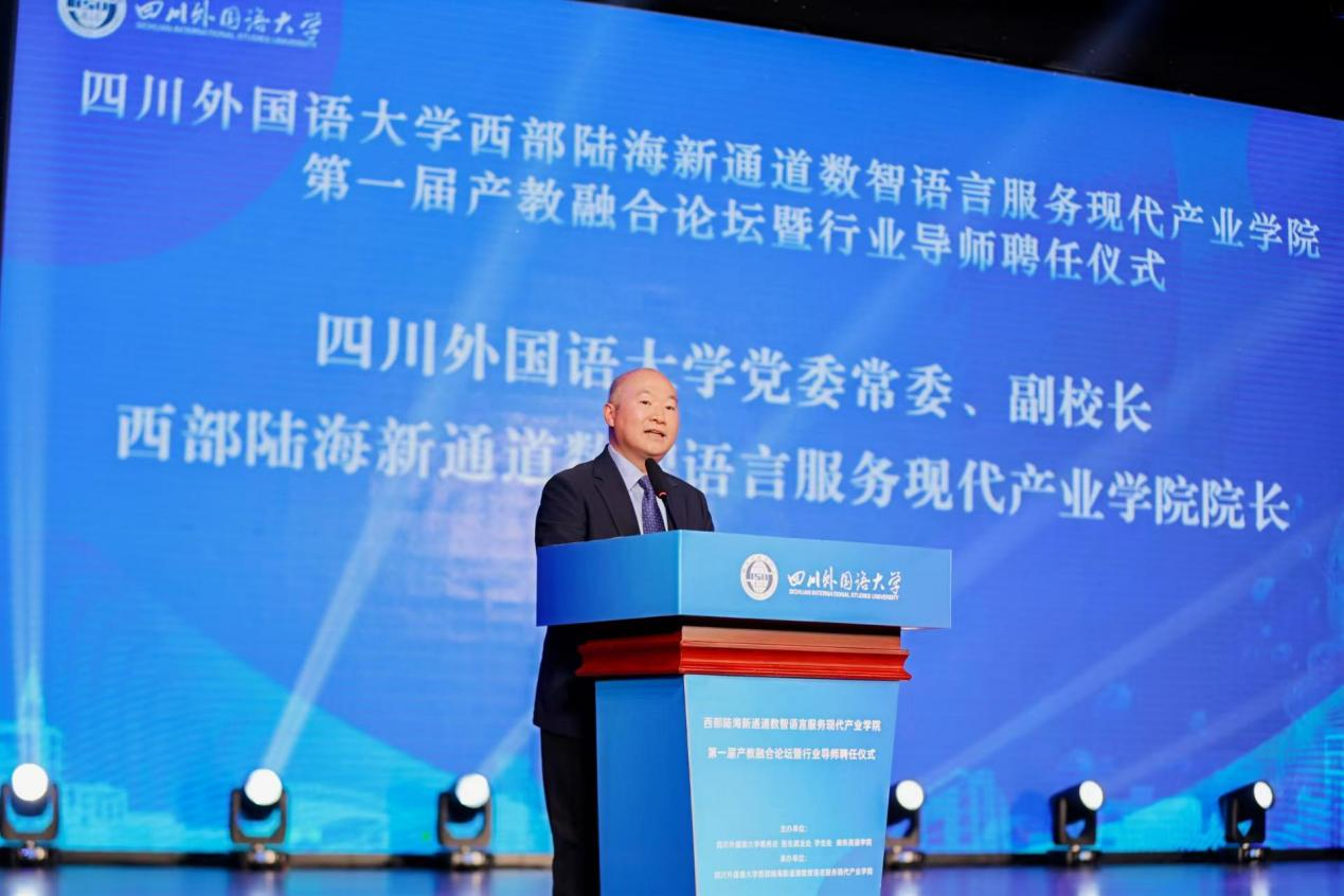 2025年11月26日,学校西部陆海新通道数智语言服务现代产业学院(以下简称现代产业学院)在东区大礼堂成功举办第一届产教融合论坛暨行业导师聘任仪式。校长董洪川,副校长、现代产业学院院长王仁强出席活动。