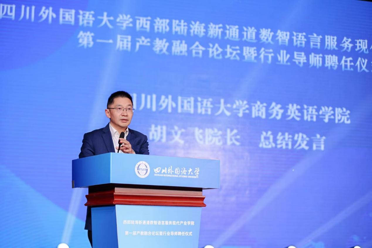 商务英语学院院长胡文飞总结发言。他指出,奖教学金颁发与行业导师聘任为现代产业学院实体化运作奠定了基础,现代产业学院将从深化协同育人、推动数字技术赋能、构建价值共创生态三个方面持续发力,切实实现校企互利共赢,为西部陆海新通道建设培育更多时代新人。