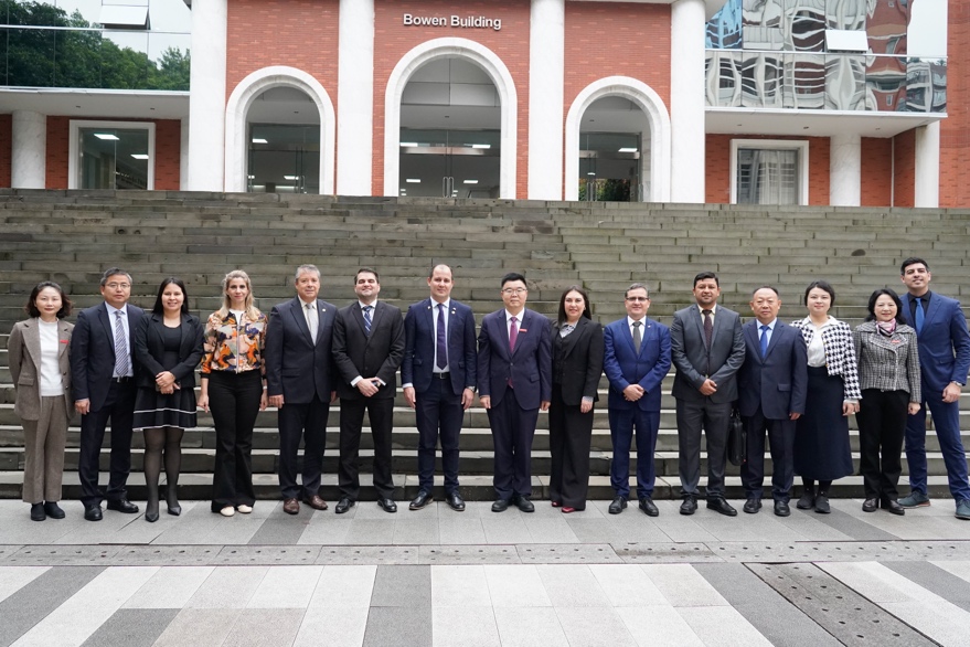 2025年10月27日上午,巴拉圭众议院代表团一行九人在众议员卡洛斯·佩雷拉率领下访问我校。校长董洪川、党委副书记苟朝莉接待了代表团并合影留念。