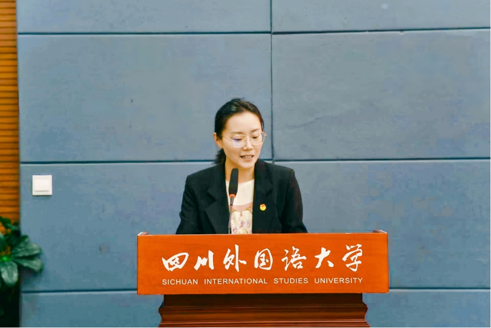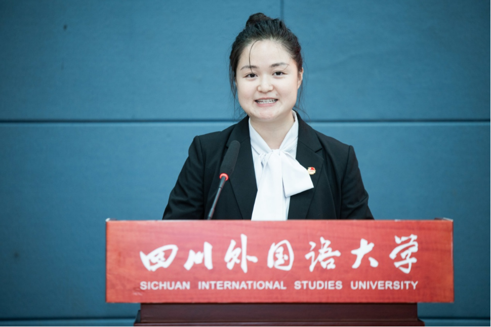 王诗瑜作《践行服务宗旨,勇担时代重任,团结带领川外青年为中国式现代化贡献青春力量》工作报告。