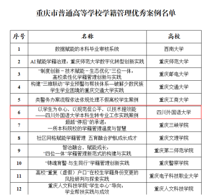 近日,重庆市教育委员会发布《关于普通高等学校学籍管理优秀案例遴选结果的通报》(渝教学函〔2025〕31号)。我校报送的《以学生为中心,以规范促公平,以技术提效能——四川外国语大学本科生转专业工作实践案例》经过专家评审,从全市48个案例中脱颖而出,成功获评市级优秀案例。