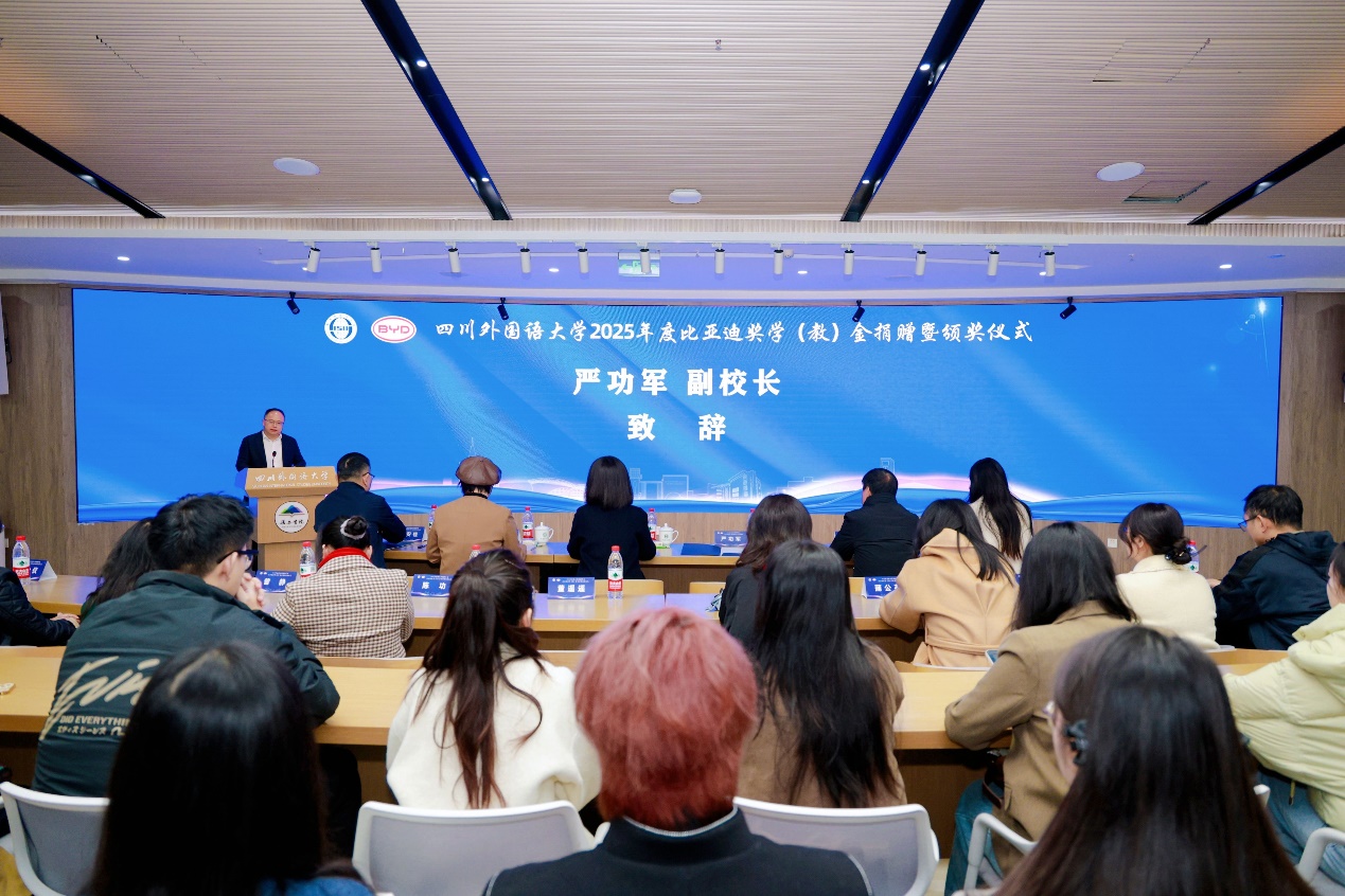 严功军在致辞中代表学校向比亚迪集团表示热烈欢迎和衷心感谢,向获奖师生表示祝贺。他指出,四川外国语大学作为西南地区外语和涉外人才培养以及外国语言文化、对外经济贸易、国际问题研究的重要基地,始终秉持“海纳百川、学贯中外”的校训精神,致力于培养具有家国情怀、全球视野、专业本领的复合型国际化人才。在百年变局加速演进的时代背景下,国家比以往任何时候都更需要能够“讲好中国故事”“服务企业出海”的时代使者,这正是川外的使命所在。
