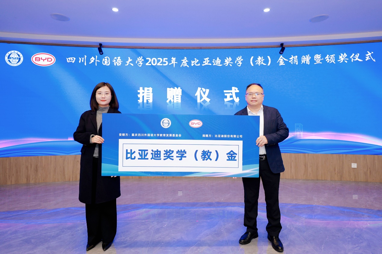 严功军表示,比亚迪作为中国民族工业的骄傲,充分展现了“中国智造”的创新实力与面向全球的责任担当。他强调,川外的育人使命与比亚迪的全球化征程在“沟通”与“跨越”两个关键词上高度契合:语言的沟通助力品牌的跨越,文化的沟通促进价值的跨越,人才的沟通驱动创新的跨越,视野的沟通成就未来的跨越。比亚迪“敢想、敢干、敢坚持”的工程师精神与川外“团结、勤奋、严谨、求实”的校风以及培养“外语+专业”“专业+外语”的创新人才育人目标同频共振,奖学(教)金的设立正是双方人才理念深度融合的生动体现。