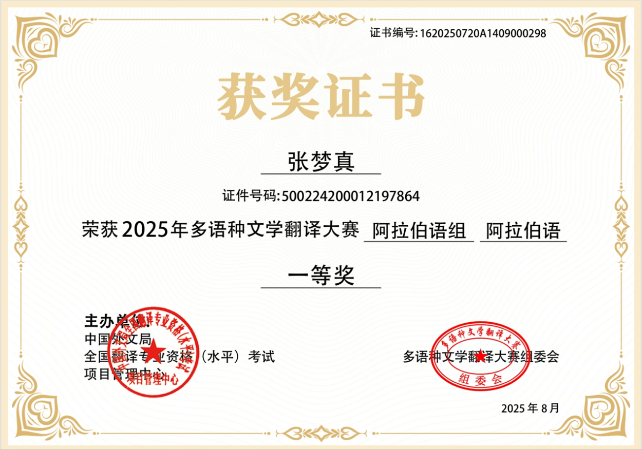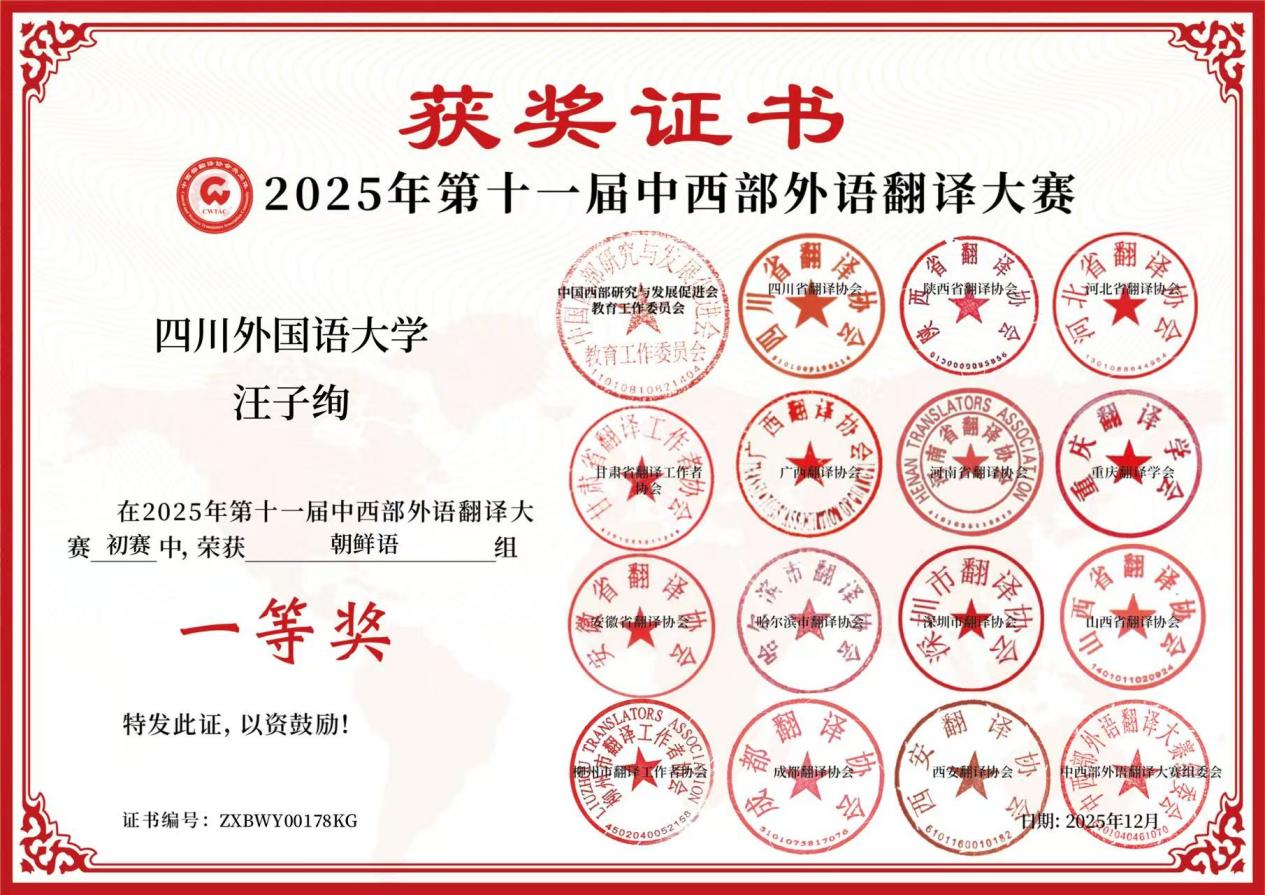 我校学子在全国其他语言类赛事中同样表现亮眼,斩获多项重磅荣誉。日语学院陈玺妃在第十九届中华全国日语演讲比赛西南赛区与顶尖选手同台竞技,以总排名第二的优异成绩夺得特等奖并获东京总决赛资格;翻译学院白星辰、东方语言文化学院张梦真、金佳怡及伦雨欣分别在第三十七届韩素音国际翻译大赛(英译汉)、2025 年多语种文学翻译大赛(阿拉伯语组)、2025 年中阿在校大学生翻译比赛(汉译阿)及 2025 年 “讲述中国” 外语写作大赛(韩语组)中斩获一等奖,展现了顶尖的翻译与写作专业能力;西方语言文化学院王雨珊凭借扎实的英语功底,夺得第四届 “BETT 杯” 全国大学生英语阅读大赛(初赛)一等奖;东方语言文化学院郑紫涵在第三届中韩友好全国大学生韩语演讲比赛中脱颖而出,荣获全国季军,成为全国韩语演讲领域的优秀代表,充分彰显了学校学子在多语种表达、跨文化交流及专业语言应用方面的深厚积淀与综合实力。