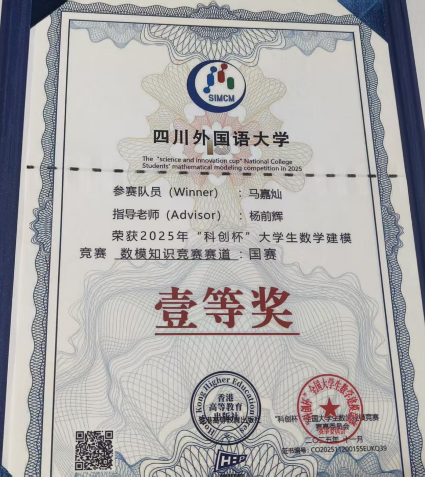 文化创意领域,新闻传播学院唐艺萌获2025西部陆海新通道视听公益广告大赛视频类三类扶持作品;体育赛事中,国际工商管理学院张鑫淼团队获 2025 年全国啦啦操联赛(重庆站)公开青年乙组集体自由舞蹈第一名,展现了川外学子德智体美劳全面发展的良好风貌。